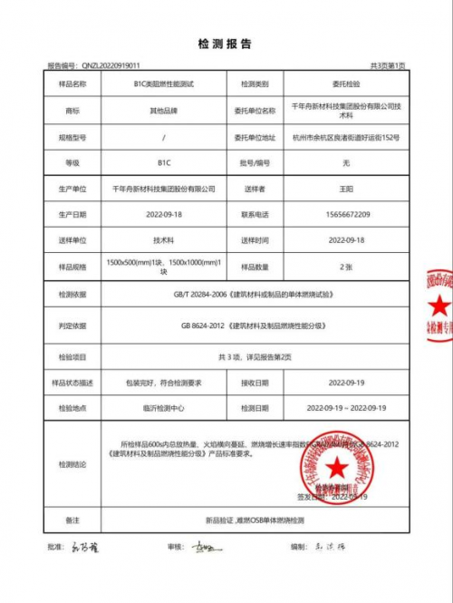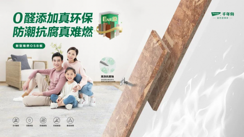 其中新型難燃OSB板作為千年舟最新一代難燃OSB板,更是在原有難燃OSB板上進行升級,提高板材實用性,讓家更安心,安全性更高。新型難燃OSB板經過阻燃處理,達到B1級難燃,同時采用微膠囊包覆技術,升級抗腐性功能,是一款具有高難燃、抗腐蝕、防潮、性能穩定的環保板材。