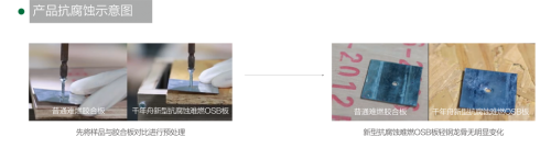 結合微膠囊包覆技術,對阻燃劑有效主體形成包覆作用,隔絕阻燃劑與金屬件的接觸,有效降低阻燃劑對金屬件的腐蝕作用,全面提高板材的抗腐蝕性,達到企業標準抗腐蝕性5級(輕鋼龍骨和自攻螺絲均無明顯變化)。