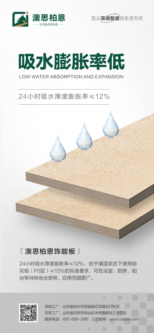 澳思柏恩飾能板24小時吸水厚度膨脹率≤12%,優(yōu)于潮濕狀態(tài)下使用刨花板(P5型)≤15%的標準要求,可在浴室、廚房、陽臺等特殊場合使用,應用范圍更廣。