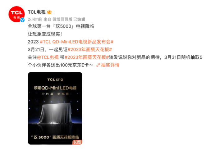 根據(jù)預(yù)熱海報(bào)來(lái)看,被稱為2023年畫質(zhì)天花板、全球第一臺(tái)「雙5000」電視為TCL X11G領(lǐng)曜QD-Mini LED電視,主打【不灼屏 更絢麗】,而「雙5000」指的則是5184個(gè)背光分區(qū)與5000nits的峰值亮度,考慮到當(dāng)前電視行業(yè)背光分區(qū)與峰值亮度數(shù)值最高區(qū)間為2000-2500,TCL X11G電視將全面刷新行業(yè)紀(jì)錄,這點(diǎn)上確實(shí)有種“王者降臨”的感覺。