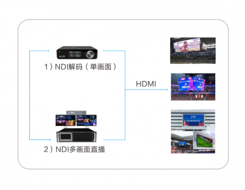 通過矩陣分發后的NDI信號,可通過千視NDI解碼器(將NDI解碼成HDMI信號)進行單畫面輸出上屏,也可部署NDI多畫面系統實現任意多畫面上屏。對于需要自主播放視頻源的屏幕,如VIP室或休息室的屏幕,千視NDI解碼器可預設9個播放地址,通過USB擴展無線小鍵盤,實現多路信號的平滑切換輸出。