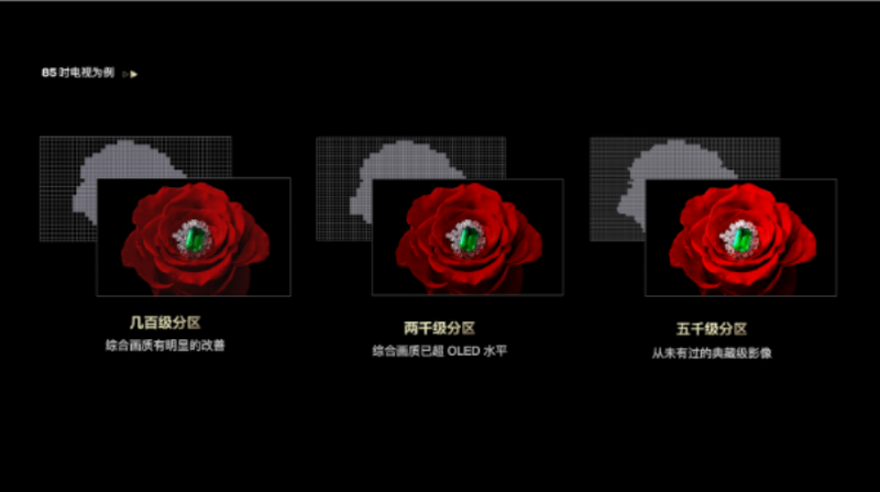 當(dāng)前,行業(yè)內(nèi)絕大多數(shù)輕旗艦級產(chǎn)品尚處于數(shù)百級背光分區(qū)、千級峰值亮度等,超高端旗艦電視的背光分區(qū)與峰值亮度數(shù)值也普遍集中于2000~2500,難以滿足消費者的更高觀影需求,類似于陽光下波光粼粼的湖面、雪山表面的反光等高亮度或者暗光影視作品無法完美呈現(xiàn),成為行業(yè)亟待解決的問題。