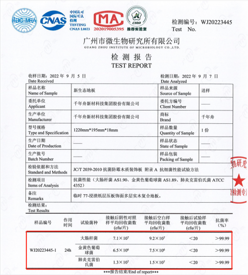 千年舟ENF級新生態地板采用天然樹木,加工成整塊的芯材,芯材加工選用生態防水膠,甲醛釋放量低于0.025g/m3,環保等級達到ENF級,打造的健康環保空間,為家人共享天倫之樂提供安全保障。千年舟ENF級新生態地板,對日常生活中常見的金黃色葡萄球菌、大腸桿菌、肺炎克雷伯氏菌,有強烈的抑制和殺滅作用,抗菌率超過99.9%(強抗細菌級),長效滅菌,凈化空氣環境,能有效保護家人,盡可能的降低疾病風險。