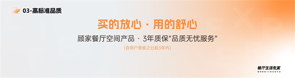 在原本3年質保的基礎上,顧家家居餐廳家具的大理石、巖板和皮革出現非人為因素導致的問題,五金功能件出現現場無法調試問題的,將提供無條件更換的服務,只換不修。(*詳情可咨詢門店,最終解釋權歸顧家家居所有。)這不僅是顧家家居對其餐廳產品品質的信心,也是對餐廳生活空間服務的承諾。