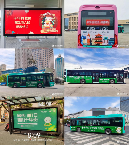 其實不止南洋國際機場,作為鹽城最重要的公共交通工具,鹽城的各路公交車上也有千年舟的廣告宣傳,從公交車車身到顯示屏,再到公交車站牌,千年舟板材遍布鹽城的大街小巷。