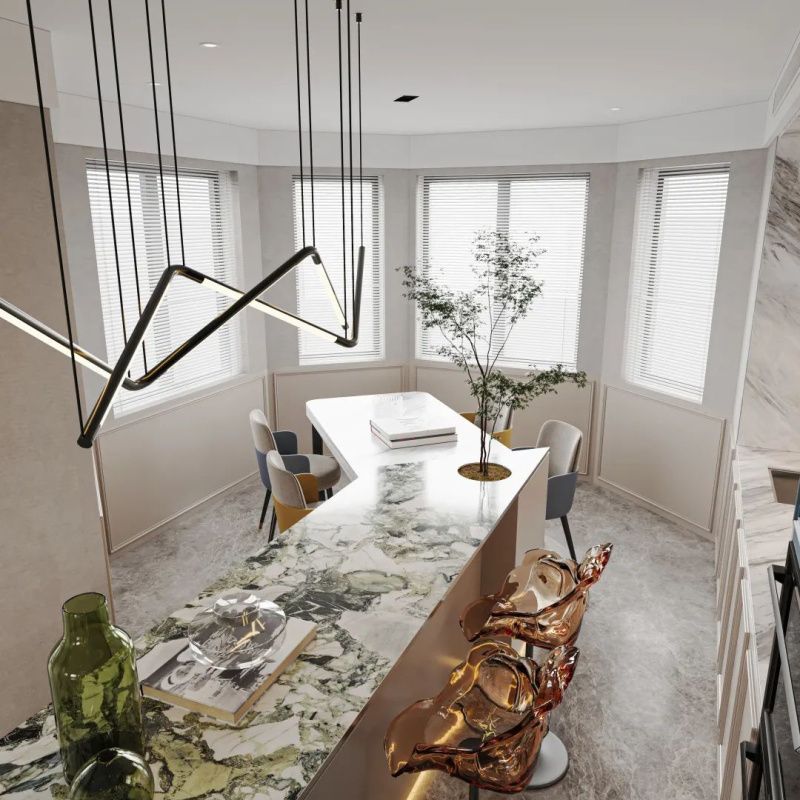 7kk設(shè)計(jì)創(chuàng)始人 麥古一老師作品-珍稀石材與雅致配色,巖板與木材、綠植融合達(dá)成了借光、借風(fēng)、借勢渾然一體的流動(dòng)性美感