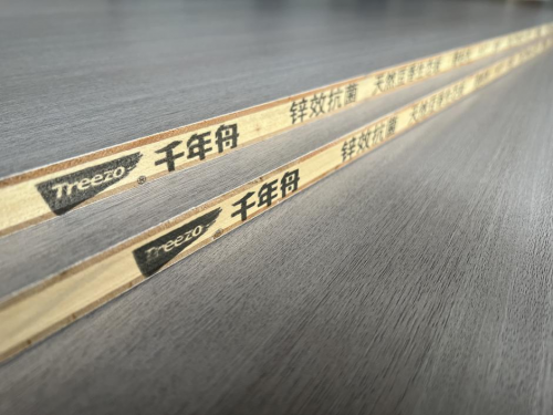 在未經封邊的板材側邊,印有一排規整且清晰的噴碼信息,信息印有千年舟板材商品名、板芯、厚度等內容。