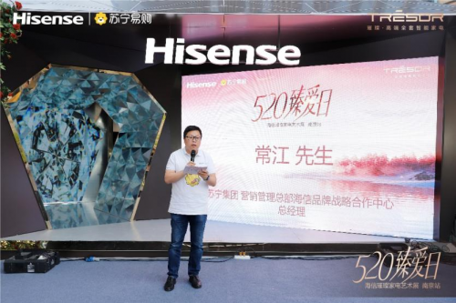 蘇寧集團營銷管理總部海信品牌戰略合作中心總經理常江先生“率先登臺致辭,細數雙方攜手走過的歲月,并向本次藝術展到場來賓送上最真摯的祝福與祝愿。言辭懇切,感情真摯,引來現場掌聲連連。