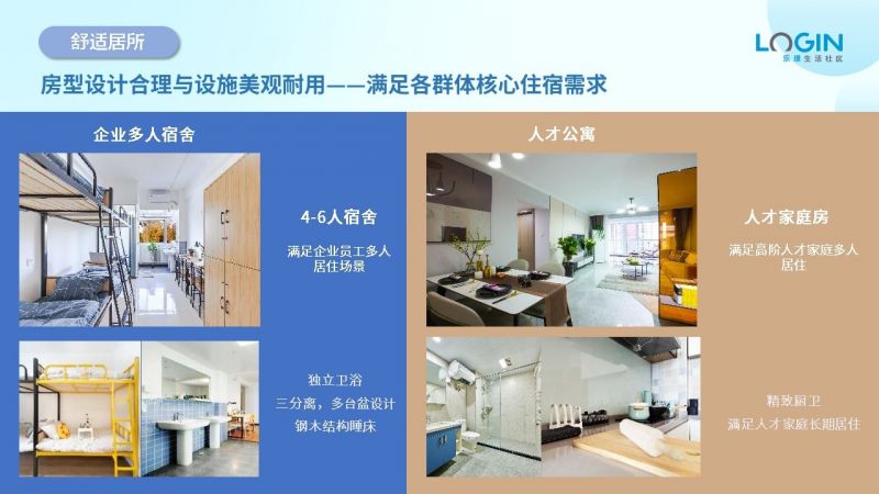 為滿足產業園內及周邊企業不同人群的住房需求,樂璟生活社區一區一策,配置不同的多人宿舍房型、單人間、雙人間或家庭套房。每個社區根據當地生活業態,可配有共享餐廳、公共廚房、公共開水間、公共健身房、閱覽區、影音區、娛樂臺球、戶外運動場等公區設施,滿足了住戶日常的便利生活需求。