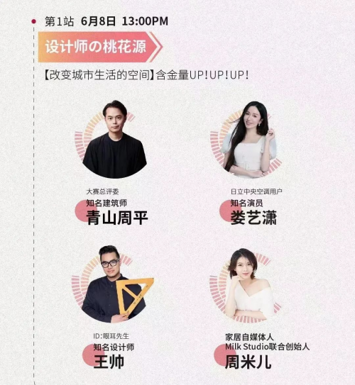 設計大咖云集,創意思潮碰撞。6月8日,日立將在設計上海上演一場大動作,盛邀著名建筑師、日立Hi-Design大賽總評委青山周平;知名演員、日立中央空調用戶婁藝瀟;知名設計師(ID:眼耳先生)王帥;家居自媒體人、Milk Studio聯合創始人周米兒等明星大咖,用一場高質量的論壇,呈現一場引爆東方美學的時尚潮流。