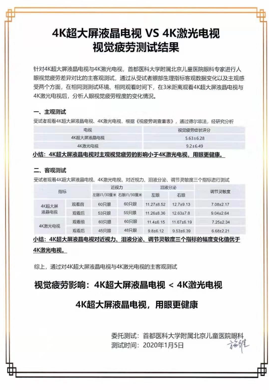 首都醫科大學附屬北京兒童醫院眼科曾就4K超大屏液晶電視和4K激光電視進行過視覺疲勞測試,經過專業醫生團隊的實測顯示,相比于激光電視,液晶電視的表現似乎是要更為“護眼”的存在。此次實測也再次引發了關于激光電視“護眼問題”的討論,究竟是創新技術、還是營銷噱頭,想必也是仁者見仁、智者見智。