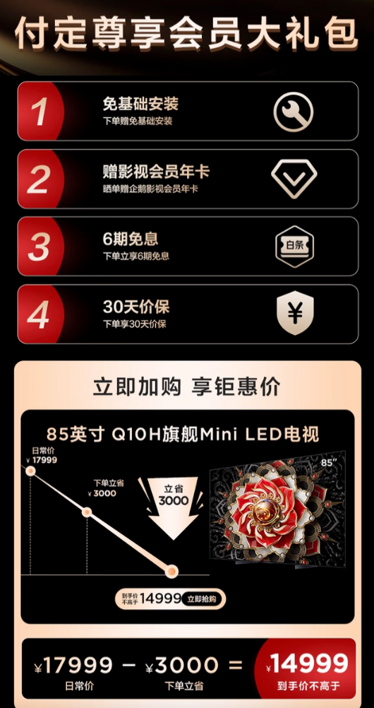 也正是基于以上這幾點,我最終敲定了TCL Q10H電視,而且選擇的是85英寸,畢竟屏幕越大、沉浸感越強(qiáng),而且TCL 85寸Q10H在618期間下單立減3000元,到手14999元,同時還免除基礎(chǔ)安裝費(fèi)、贈企鵝影視會員年卡、下單立享6期免息,以及30天保價等等,可以說優(yōu)惠力度相當(dāng)?shù)轿涣耍晕移炔患按拖聠瘟恕?/p>
