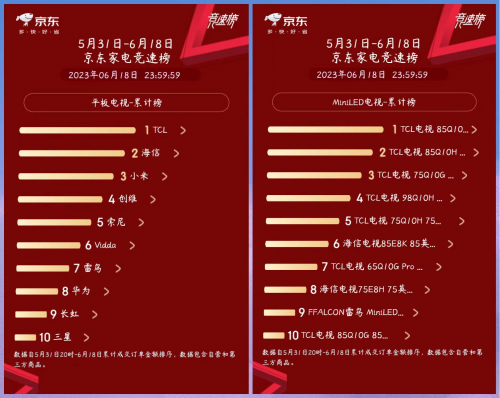 京東、淘天貼身肉搏,試圖用百億補(bǔ)貼“擊穿底價(jià)”;拼多多異軍突起,打破維持?jǐn)?shù)年的平衡;直播、內(nèi)容電商入場(chǎng),進(jìn)一步加劇了618的激烈競(jìng)爭(zhēng)。雖然各大家電賽道競(jìng)爭(zhēng)前所未有的激烈,但其中不少賽道疑似早早畫上了句號(hào),從預(yù)售期到銷售期,再到結(jié)束,榜單名次幾乎沒有發(fā)生過任何變化,其中表現(xiàn)最明顯的莫過于電視賽道,不論是銷量總榜還是細(xì)分賽道,“強(qiáng)者更強(qiáng)、弱者更弱”的馬太效應(yīng)加劇,而作為國產(chǎn)電視品牌領(lǐng)頭羊的TCL從頭至尾都保持著極大的品牌優(yōu)勢(shì),更是直接拿下電視全網(wǎng)銷售額冠軍。
