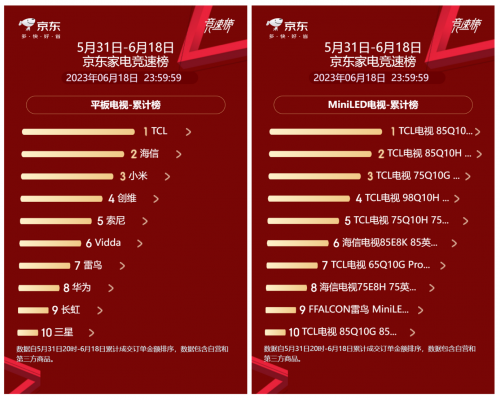 伴隨著618的結束,年中各品牌的“大考”也正式落下帷幕了,在家電領域今年TCL的表現可謂是相當亮眼,TCL 618電視銷量排名第一,總銷售額位列榜首,且一舉奪得了包括Mini LED電視、量子點電視、75吋+超大板電視、98吋巨幕電視在內的多項全網銷量與銷售額的雙冠軍。尤其是在Mini LED電視領域,更是獲得了京東競速榜排名前十占八的表現,可謂是霸榜618。