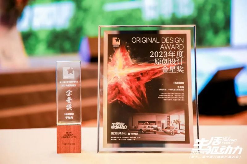 在晚上的頒獎典禮上,千年舟再次刷新品牌榮譽榜!憑借原創花色“千舟風渡”、“凝徽舟韻”榮膺“2023年度原創設計金星獎”!