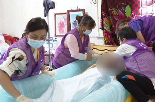 家住辛豐鎮(zhèn)黃墟村的尹奶奶,在去年不慎摔倒骨折,自此只能臥床修養(yǎng)。據(jù)悉,尹奶奶有兩個(gè)兒子,大兒子長(zhǎng)期在外務(wù)工,由患小兒麻痹癥的小兒子照顧尹奶奶的日常起居。由于體力的問(wèn)題,在洗浴方面,尹奶奶的小兒子只能進(jìn)行簡(jiǎn)單的擦拭。得知這一情況,樂(lè)惠居立刻組織了專(zhuān)業(yè)助浴小組,為老人定制助浴方案。