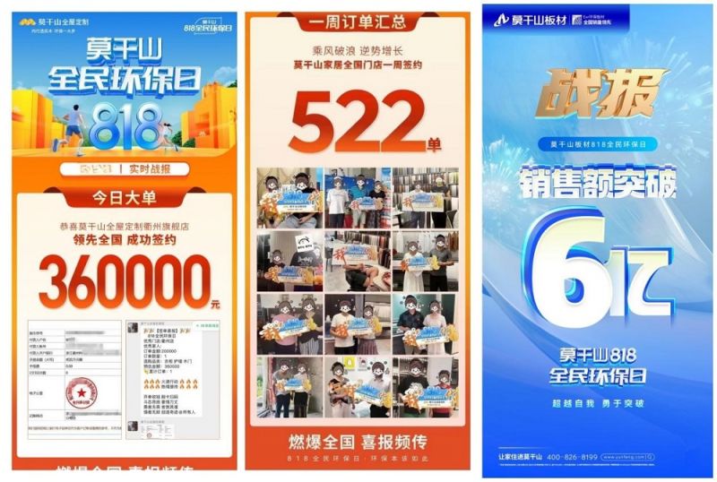 這場看似是數字角逐的戰役背后,實則是全渠道的博弈。本次云峰莫干山818全民環保日,完善布局,實現全渠道統一發力,不斷打響多維立體的市場攻堅戰。借助電商大數據與傳統渠道相互賦能,全方位打通線上線下銷售渠道,實現了數字化運營閉環,聯動多個官方線上渠道以及線下千家門店, 實施超大力度優惠活動,真實讓利消費者。以秒殺、買贈、大額優惠券、抽獎免單等空前福利作為殺手锏直擊人心,一場福利盛宴吹響云峰莫干山進攻的號角。第二屆云峰莫干山818全民環保日,延續首屆惠民+環保的主旨,通過工廠直供產品、總部直播支持、線上旗艦店與線下門店多方聯動的方式,充分釋放國民品牌熱度,實現銷量與口碑的雙贏。在短短幾天的活動中,云峰莫干山全國門店簽單不停,戰報連連,無論是新房裝修還是老房煥新等客戶,都紛紛選擇搶在活動期間下單,場面陣容之盛大,活動反響之熱烈,堪稱業內萬眾矚目的一次盛會。