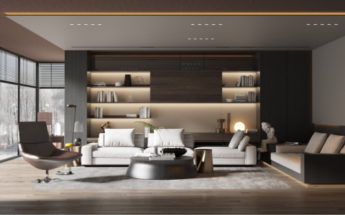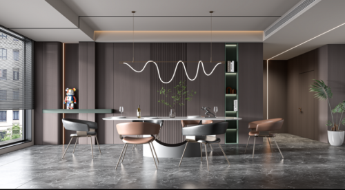 千舟風渡以烏篷船為設計元素,搭配啞光棕色色調,極具包容性,自然舒緩的層次源自大自然的質樸,為空間帶來溫暖和煦的視覺享受,樸實無華卻又不失靜雅之美,呈現出一個自然優雅的家居空間。