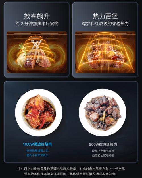 凱度星級美食研發中心實驗發現,1100W黃金第六檔不僅加熱效率更快、效果更好,還能實現微波無油烹飪。如用凱度“微魔方”微蒸烤炸燉一體機制作紅燒肉,選用1100W微波烹飪,脫脂會更快,增稠上色效果會更好,成品紅燒肉的口感也異常清爽,肥而不膩。