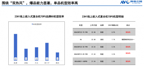 凱度一直是嵌入式微蒸烤領域的領頭羊,今年上半年依舊呈現了極度亮眼的市場表現,銷售遙遙領先。奧維云網數據顯示,在23H1線上嵌入復合機TOP5品牌80機型中,凱度位列第一,且與其他品牌拉開了相當大的差距;在23H1線上嵌入式復合機TOP5機型中,凱度就坐擁了4席,在洶涌的市場競爭中獨占鰲頭,具有爆品能力顯著、單品機型效率高的特點。