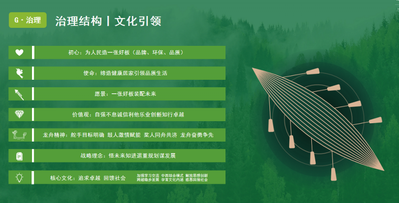 G即治理,龍舟精神、正道經(jīng)營(yíng)、打造綠色內(nèi)循環(huán)。秉承“自強(qiáng)不息 誠(chéng)信利他 樂業(yè)創(chuàng)新 知行卓越”的龍舟精神,以“追求卓越 回饋社會(huì)”為核心文化,千年舟通過治理結(jié)構(gòu)、文化引領(lǐng),不斷向前。