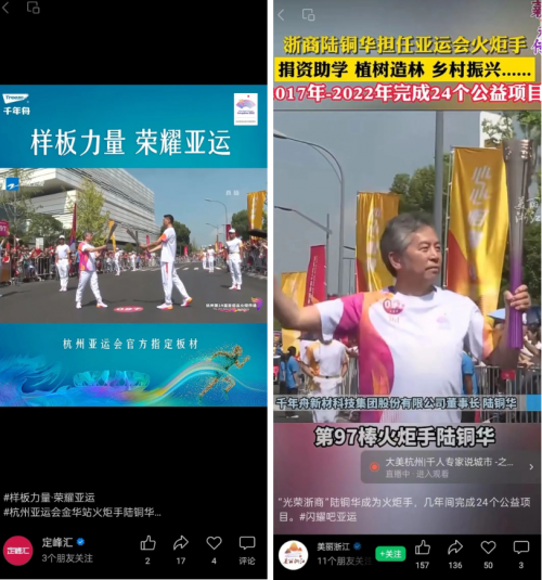 此次千年舟集團董事長陸銅華擔任亞運會火炬手,不僅得到了廣大民眾的歡呼和鼓勵,更得到了浙江多個主流媒體的轉載與采訪,包括由浙江省人民政府新聞辦公室推出,浙江廣電集團運營的“美麗浙江”、浙江經視、FM93交通之聲、定峰匯等新媒體賬號第一時間進行了跟進報導,權威力量的發聲再一次奠定了千年舟集團巨大的品牌影響力。