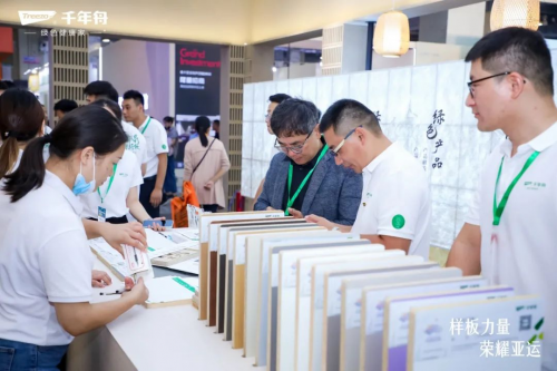 展會期間,千年舟精心設(shè)計(jì)打造的“傳承共生,碳尋未來”展位憑借傳承自5000年良渚文明的深厚文化內(nèi)涵和與亞運(yùn)綠色辦賽完美契合的千年舟“綠色健康家”理念在本次展會中大放光彩,引來無數(shù)參展者駐足流連。