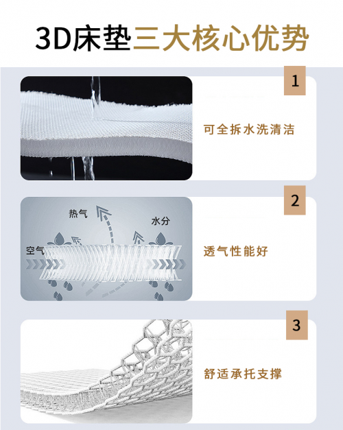 人在睡眠過程中,身體會不斷地散發熱量,如果床墊和床單不夠透氣,熱量不能及時散發,人體就會感到悶熱、不斷流汗。3D材料透氣性好,有利于加快熱量和濕氣的散發,營造一個干爽舒適的睡眠環境。