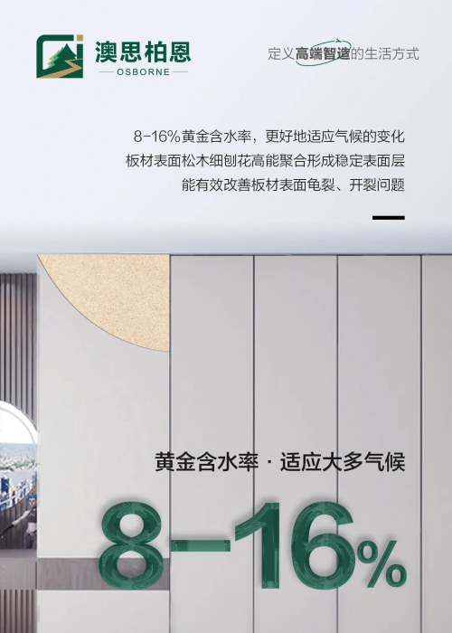 一張好板,適用南北每一家。澳思柏恩飾能板飾面系列為多層芯材結構,能夠顯著提升板材內部穩定性。板材經加工后鎖定8-14%黃金含水率,能夠更好地適應氣候變化。同時板材表面添加高能聚合的松木細刨花形成穩定表面層,能有效改善板材表面龜裂、開裂問題,讓居家生活變得更簡單。