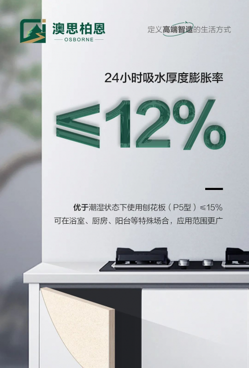 經過實驗,板材厚度膨脹率≤12%,優于國家標準要求,可在浴室、廚房、陽臺等特殊場合使用,應用場景更全能,無懼潮濕考驗,打造方寸之間的美好。