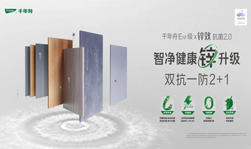 千年舟鋅效抗菌2.0生態板,添加鋅離子抗菌技術,能有效抑制大腸桿菌、金黃色葡萄球菌、銅綠假單胞菌、肺炎克雷伯氏菌四種菌種生長,抗菌率達99.99%。經一次完整皮膚刺激試驗結果無刺激,急性經口毒性試驗結果屬實際無毒級物質,兼具四重抗菌、高效抗菌、安全抗菌、24h全天候抗菌四大優勢。