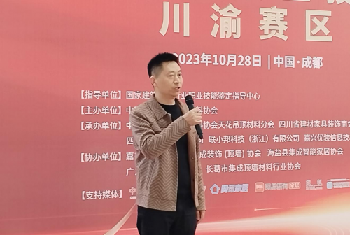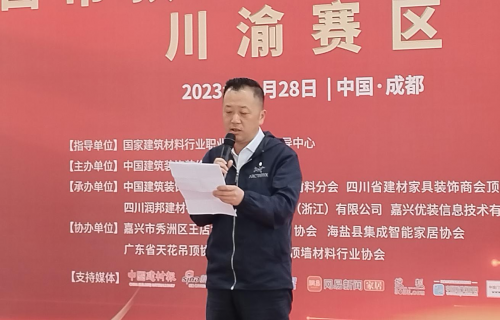 承辦單位代表,分會副會長、四川省建材家具裝飾商會頂墻集成分會會長、四川潤邦建材有限公司總經(jīng)理張先文上臺致辭,他表示感謝川渝地區(qū)的安裝工師傅過來參加本次比賽,鼓勵參賽者要堅持不斷學(xué)習(xí)和提升自身的能力,只有不斷創(chuàng)新、不斷超越,才能為行業(yè)的繁榮作出貢獻。本次大賽始終秉持著“公平、公正、交流、選才”的宗旨,搭建吊頂安裝交流平臺,讓吊頂行業(yè)安裝工精英們匯聚一堂,切磋技能,交換吊頂安裝心得,共同營造積極向上,相互學(xué)習(xí)的吊頂技術(shù)安裝環(huán)境;竭誠營造尊重技能、崇尚技能的行業(yè)氛圍。在接下來的比賽中,愿大家賽出友誼,賽出水平,從而更大力度的推動吊頂行業(yè)企業(yè)高質(zhì)量飛速發(fā)展。