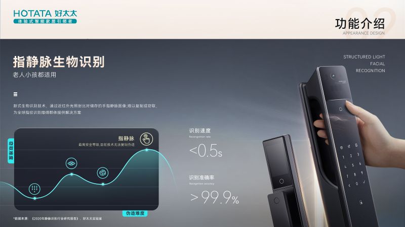 它擁有多種解鎖方式,其中最為便捷的是人臉識別和指靜脈識別方式,無論是粗心忘帶鑰匙,還是手提重物不方便翻找鑰匙開門的情況,都可以通過這兩種方式識別開鎖,而且安全性也很高。其中人臉識別系統是采用活體深景檢測,紅外光投射器經DOE衍射到人臉上,采集計算得出每個投射點的三維深度信息,可以防止照片和視頻冒充解鎖。而指靜脈識別,是一項新的生物識別技術,因為指靜脈信息唯一且無法仿制,且識別過程必須是有血液流動的活體才能識別,安全性也升級到新高度,識別速度更快,不到半秒時間就能識別開門了。