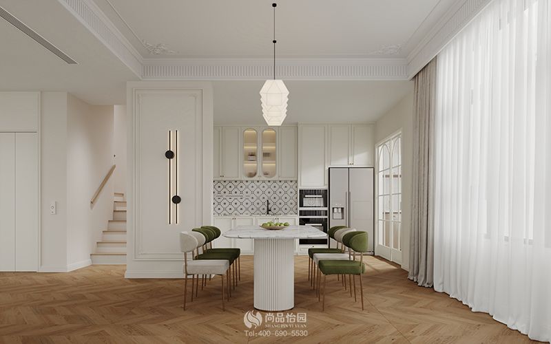 前言:本案例位于劍橋郡一期,是一棟有著440平方米的大戶型別墅。設計師在與業主的溝通中了解到,該別墅是由是業主夫妻二人和小朋友居住,未來也會住家保姆,且雙方父母偶爾過來。喜歡法式,輕奢,奶油感覺。同時了解到女業主喜歡奶油白色,綠色,金色等耐看色,不喜歡飽和度太高的顏色。因此設計師選用了輕奢法式奶油風裝飾空間,借用輕柔的色彩與簡約的設計打造溫馨而又高級的家居環境。