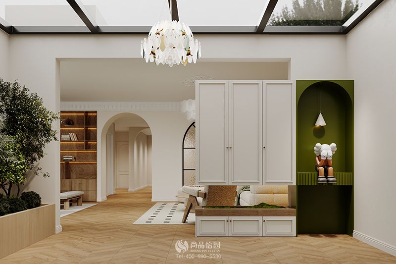 設計師利用經典的魚骨拼地磚、石膏線條、裝飾畫、折疊門、清爽蔥郁的綠植,為空間增加輕盈感和自然感,打造出通透愜意慵懶的公區空間。