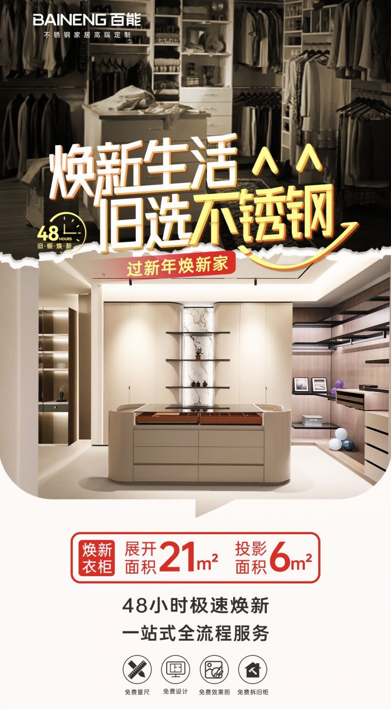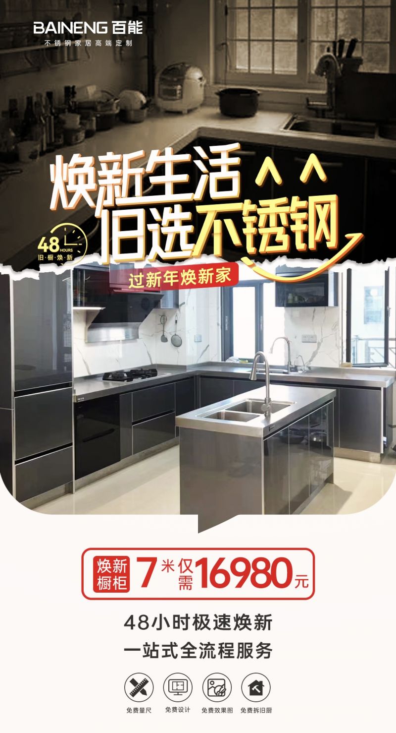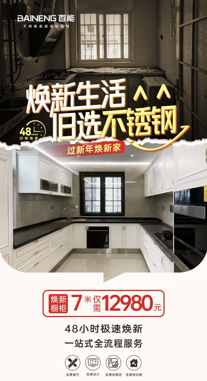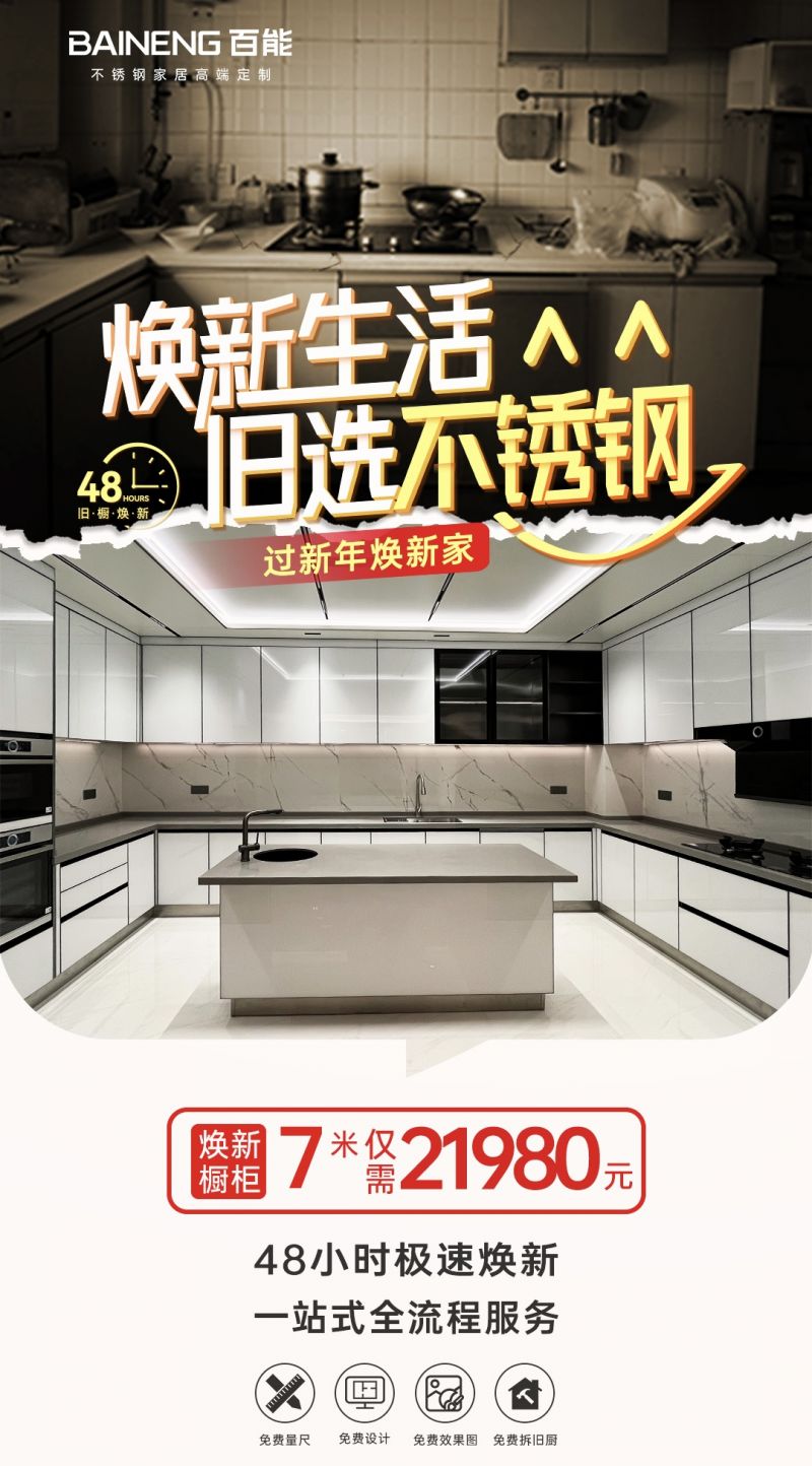2023年11月25日,百能家居發起舊廚煥新活動,該活動是不銹鋼家居行業首個以舊廚改造為主題的活動,旨在為客戶解決舊廚房常見的痛點問題,為人們帶來高品質的家居生活。