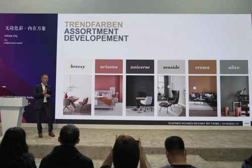 好的市場數據當然離不開好的產品。SCH?NER WOHNEN-Farbe一直以來以高環保的標準,推出消費者喜愛的色彩。本次論壇,Frederik Strotmann發布2024年年度色仍為芒草暖cosy。此外,Frederik Strotmann表示,預調色一直是SCH?NER WOHNEN-Farbe的特色產品,2024年還將為中國市場帶來6大城市預調色Trendfarbe新色。Dirk Nienhaus則對預調色代表天鵝堡預調色Designfarben做了產品介紹及新色推介。