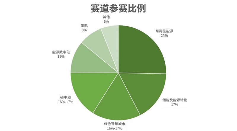 在全球轉(zhuǎn)型非化石能源,以及氣候行動(dòng)加速的大趨勢下,可再生能源賽道是今年大賽的最熱門賽道,項(xiàng)目占比25%,緊隨其后的是儲(chǔ)能及能源轉(zhuǎn)化賽道,占比17%。城市是人類應(yīng)對(duì)氣候變化最重要的陣地,今年大賽新增綠色智慧城市賽道也受到廣泛關(guān)注,與碳中和賽道勢均力敵,兩個(gè)賽道占比均在16%-17%之間,能源數(shù)字化賽道占比11%,氫能賽道占比8%。其他創(chuàng)新項(xiàng)目占比6%。
