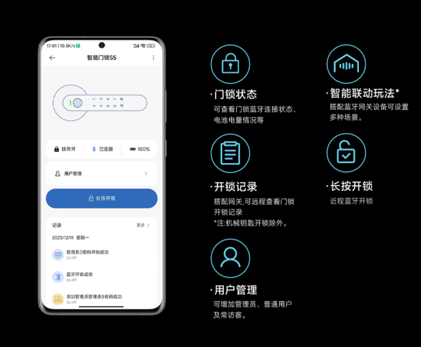 門鎖日常使用支持數(shù)字密碼、指紋識別、手機藍牙、周期密碼以及應急機械鑰匙開鎖,采用的半導體指紋識別技術,具有識別速度更快、識別率更高的特點。