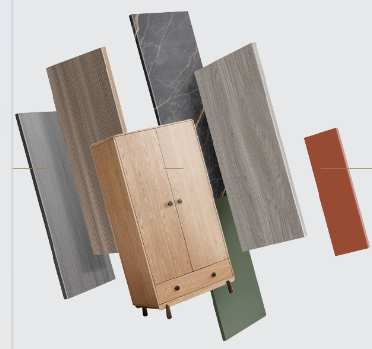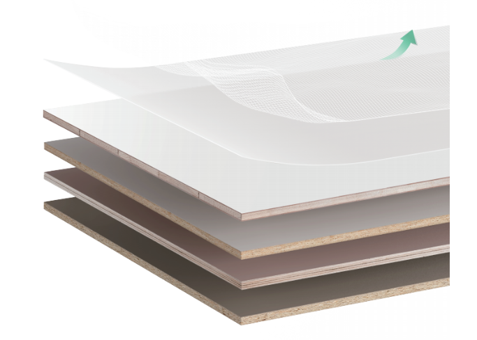 千年舟家具飾能板飾面系列是以多層飾能板或實木飾能板為基板,采用 UV、PET、PVC 等多種類型的飾面板材制作而成,板芯使用全桉木,進口松木刨花表面高能聚合,表面超平整,多層縱橫交錯十字穩定結構,抗變形效果強!同時搭配的花色多樣、色澤美觀,產品自上市以來,契合終端客戶追求,深受市場一致好評。