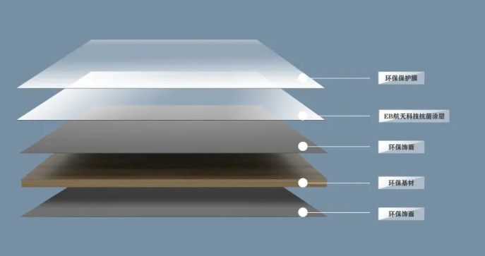 千年舟EB超耐板是2023年千年舟家具廠渠道新推出的又一款創新性功能板材。它是采用電子束進行涂層固化的技術將EB涂料附在生態板表面,再覆上一層環保保護膜而成。成板具有耐候耐曬不變色、抗菌抗霉無異味、抗刮抗擦硬度高、耐污耐臟易清潔和輕微劃痕熱修復的五大功能特點。
