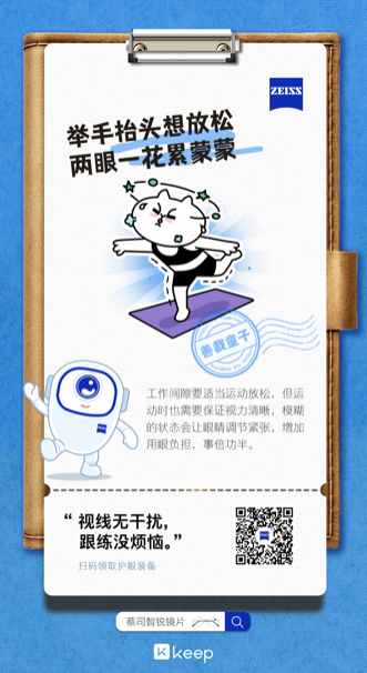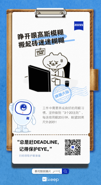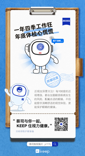 蔡司光學作為“職人季”合作伙伴,與Keep共同發起“職場診脈”的互動體驗報告,喚起職場人群保護眼健康的意識。蔡司光學一直致力于挖掘細分人群的用眼需求,為用戶提供專業的個性化解決方案,并通過跨界創新營銷模式不斷拓展用戶圈層。而Keep作為“運動科技第一股”,擁有大量熱愛運動的職場人士,蔡司光學借此契機成功對眼健康保護與視覺體驗的關注,推廣給更精準的職場人群,為Keep用戶提供個性化解決方案,精準觸達潛在消費人群,占領用戶心智。