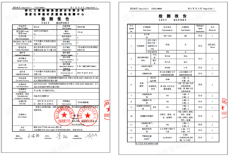 千年舟悅木板生產過程采用環保膠水,零甲醛添加,板材環保等級可達到ENF級。板材表面采用千年舟鋅效抗菌2.0三胺紙,成品板材抗菌、抗病毒、防霉,實現雙抗一防。同時杉木原材自帶純天然清香,讓生活在呼吸間倍感清新,讓家居空間更加健康環保。
