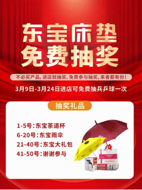 為感恩回饋廣大新老顧客一直以來對東寶床墊的支持與厚愛,3月9日-3月24日,東寶床墊東莞專賣店舉行免費抽獎活動,不必買產品,進店就可以免費抽獎!