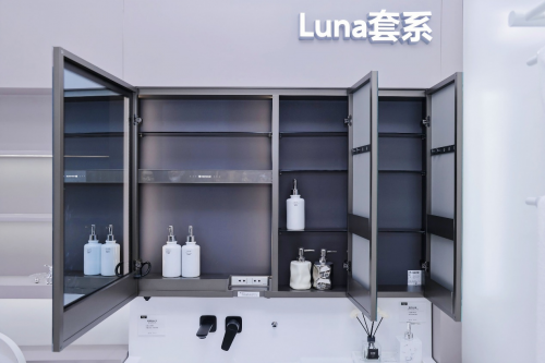 Luna浴室柜則搭載智控透視鏡面,鏡面可與內(nèi)燈聯(lián)動,并根據(jù)人體感應(yīng)在透視與鏡面效果間自由切換;同時,內(nèi)置松下nanoe?X除菌黑科技為護(hù)膚品和洗漱用品除菌,守護(hù)家人健康;收納設(shè)計方便日常用品分類放置,合理擺放便于家人日常使用。