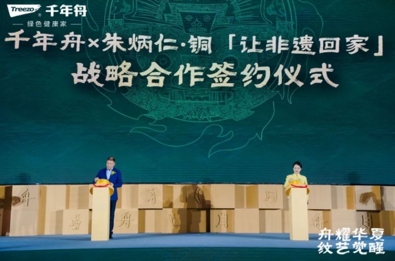 隨后,千年舟集團(tuán)副總裁田茂華和朱炳仁銅藝股份有限公司總經(jīng)理俞劍偉,共同簽訂了“千年舟x朱炳仁·銅 讓非遺回家”戰(zhàn)略合作協(xié)議,以期以跨界聯(lián)動(dòng)為契機(jī),以傳統(tǒng)文化為載體,借助廣泛的合作與交流,譜寫賦新華夏文化新風(fēng)尚。