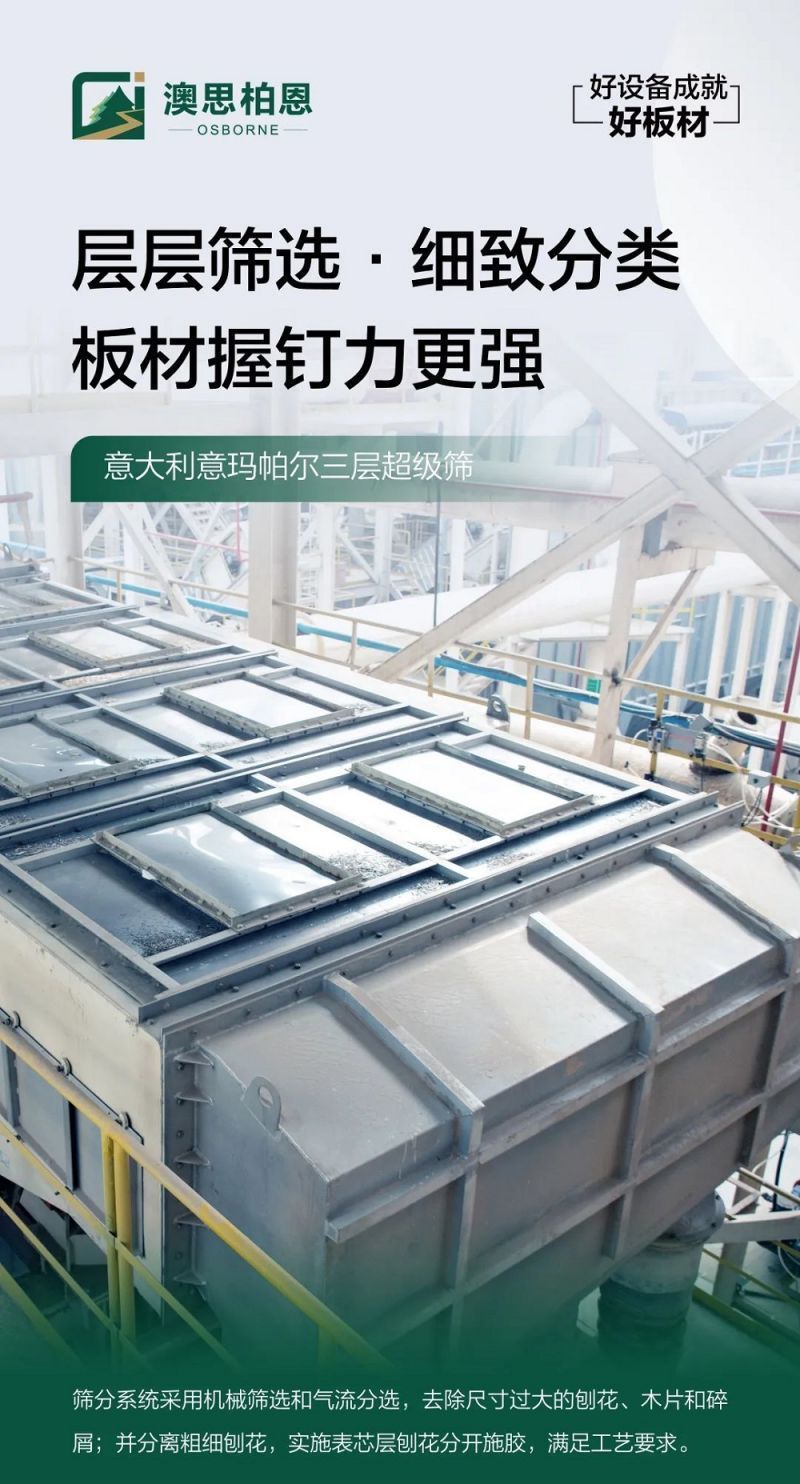 刨片質(zhì)量的好壞對(duì)定向結(jié)構(gòu)刨花板的質(zhì)量起決定性作用,澳思柏恩引進(jìn)德國帕爾曼長(zhǎng)材刨片機(jī),通過旋切方式,將原材加工成40-100mm長(zhǎng)、5-20mm寬、0.3-0.7mm厚的細(xì)長(zhǎng)刨片,木材利用率高,刨片質(zhì)量好,形態(tài)更均勻,性能更強(qiáng)韌。