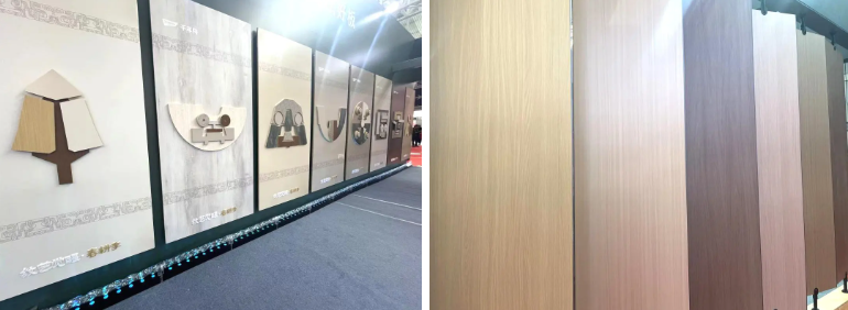 在基材展示區,觀眾們能夠領略到從天然木皮紋理到良渚IP花色的豐富多樣,每一款花色都散發著濃郁的神秘色彩。玉鳥、玉器、旋渦紋等紋路,每一個細節都彰顯著千年舟對傳統文化的尊重與傳承。