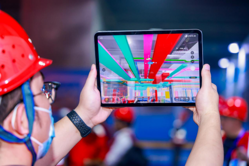據項目負責人介紹,本項目機電預留預埋線管約70萬米,面對管線密集、預埋工程量大這一難題,項目研究并應用了BIM+AR反向定位線管預埋技術,在支吊架施工階段,通過AR虛擬疊加技術,將隱蔽的機電線管虛擬投射在樓板上,避開了支架底座位置,滿足一次結構內預埋線管安全、便于識別以及提高利用率要求,避免暗埋線管的損壞、造成返工和防止觸電安全事故發生。