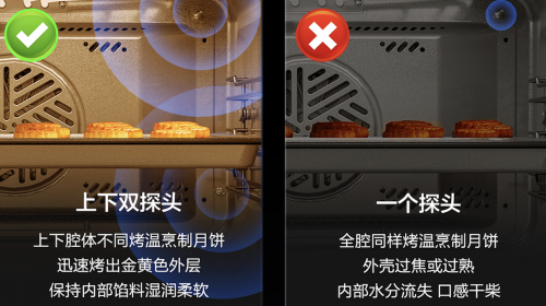 有時(shí)候在烘烤過程中,要對(duì)溫度有著非常精準(zhǔn)的控制,比如烤披薩,上層溫度要達(dá)到180度,下層為200度,溫差達(dá)到20度才能保證披薩咬起來上層松軟下層酥脆。怎么能達(dá)到精準(zhǔn)控溫,這就要依靠腔內(nèi)的溫控探頭,老板蒸烤炸一體機(jī)CQ9068上下各1個(gè)探頭,一共2個(gè),可以精準(zhǔn)控溫,這幾乎就是高端蒸烤炸一體機(jī)的標(biāo)配了。很顯然,市場(chǎng)上一些較低端的產(chǎn)品,不會(huì)明確標(biāo)注幾個(gè)溫控探頭,這種基本就是1個(gè),而這也意味著你不能用它來做復(fù)雜的美食。